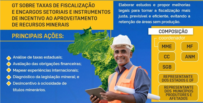GT sobre Taxas de Fiscalização e Encargos Setoriais e instrumentos de Incentivo ao Aproveitamento de Recursos Minerais - Realizar estudos sobre as taxas de fiscalização e outros encargos, visando um ambiente mais justo, previsível e eficiente, além de desincentivar a retenção de áreas sem produção mineral;