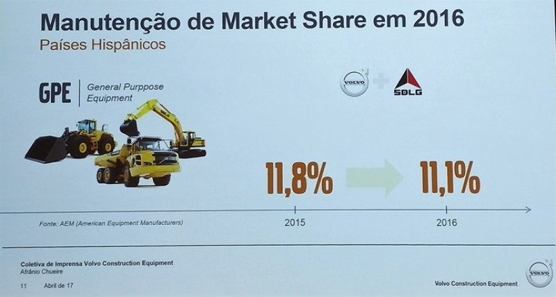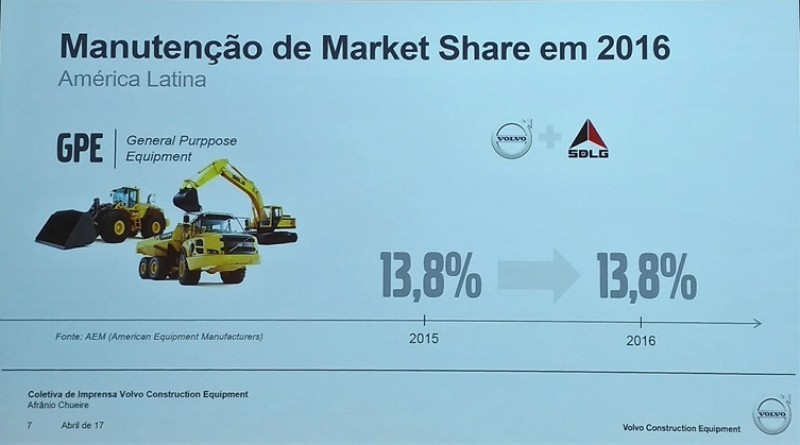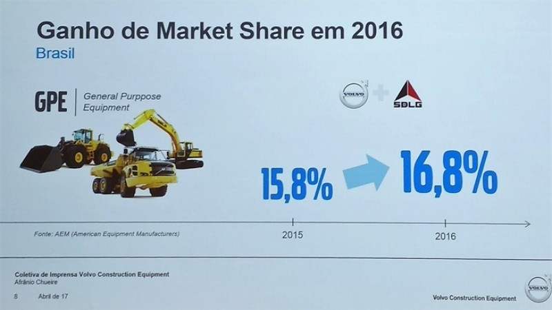 A Volvo Construction Equipment Latin America manteve as vendas e cresceu sua participação em alguns segmentos em 2016. “Foi um ano de mudanças, para nos adaptarmos a um mercado ainda mais competitivo. Conseguimos reagir rapidamente, reestruturando nossa organização e trabalhando de maneira assertiva com nossas duas marcas: Volvo e SDLG. Estamos prontos para grandes lançamentos em 2017”, declara Afrânio Chueire, presidente da Volvo CE Latin America.